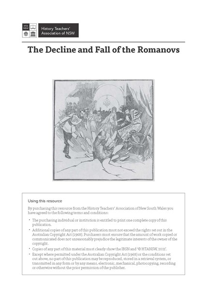 This resource is designed to support students working through the Decline and Fall of the Romanovs Case Study in Year 11 Modern History. It includes four major sections, each containing a variety of sources and activities to help students develop knowledge and skills relevant to this topic and to the study of Modern History more generally. It is not expected that students would complete all sections or even all activities within this resource. Instead, they are designed so that teachers or students might select the most relevant or interesting elements at an appropriate level of challenge. It is envisaged that this resource would be used as a supplement to other textbooks, readings and class resources.